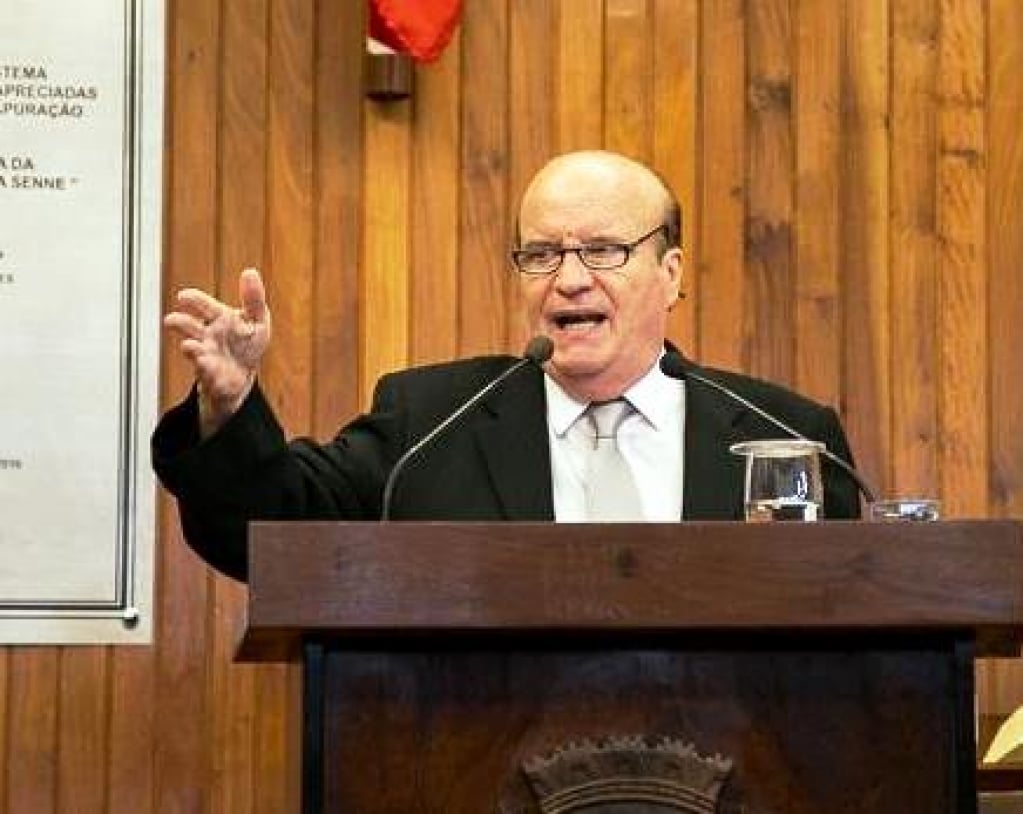 Legenda: Vereador Luiz Eduardo Nardi na tribuna da Câmara