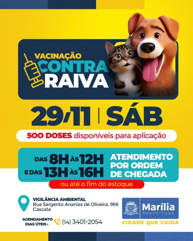A vacinação antirrábica é promovida pela Prefeitura de Marília, por meio da Secretaria Municipal da Saúde, sendo realizada pela equipe da Divisão de Zoonoses, em parceria com os alunos do curso de Medicina Veterinária da Unimar (Universidade de Marília).