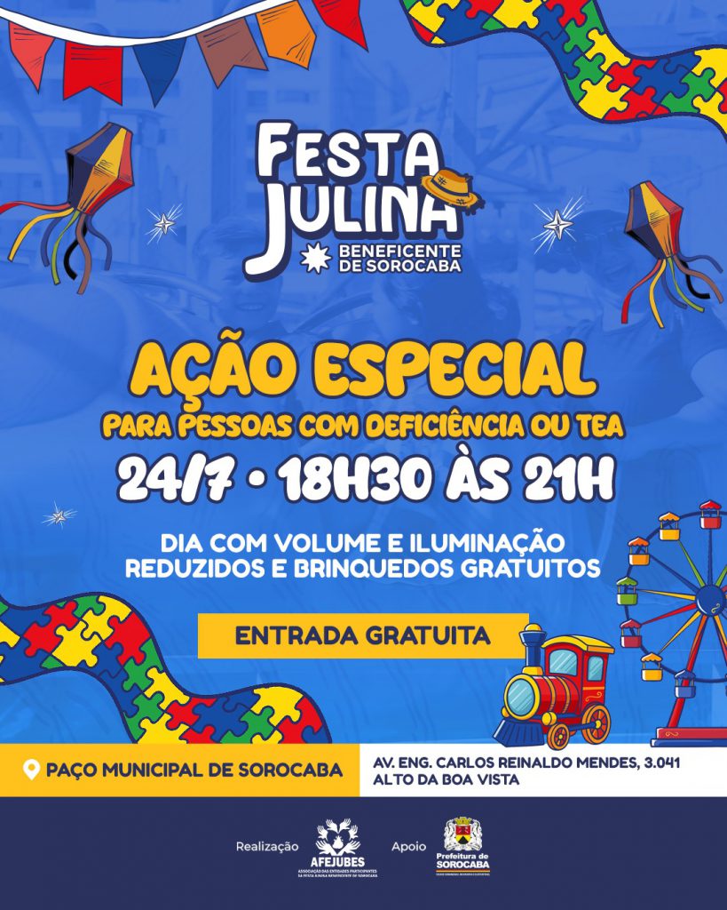 A 44ª Festa Julina Beneficente de Sorocaba – Arraiá da Família oferece, na próxima quinta-feira (24), das 18h30 às 21h, um ambiente inclusivo para que pessoas com deficiência ou TEA (Transtorno do Espectro Autista) igualmente possam aproveitar as atrações, de maneira acolhedora e confortável.