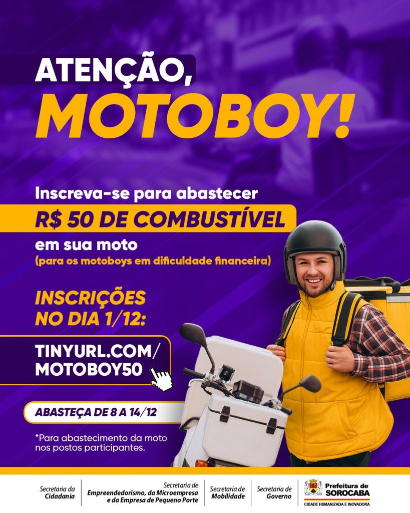 A Prefeitura de Sorocaba, por meio das secretarias de Governo (Segov), de Mobilidade (Semob), da Cidadania (Secid) e de Empreendedorismo, da Microempresa e da Empresa de Pequeno Porte (Semepp), disponibiliza crédito de R$ 50 para os motoboys cadastrados no sistema CadÚnico. As inscrições para esta terceira etapa do programa estão abertas pelo link: https://agenda-eventos.sorocaba.sp.gov.br/50-reais-para-os-motoboys/.