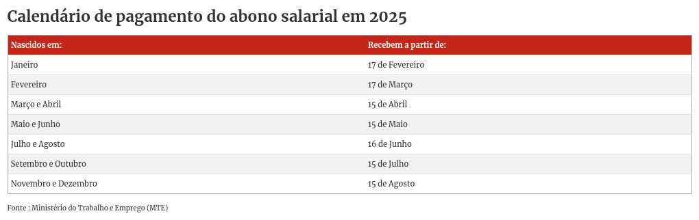 - Para ter direito ao abono salarial, o trabalhador deve ter sido informado pelo empregador na Relação Anual de Informações Sociais (Rais) até 15 de maio de 2024, ou no eSocial até 19 de agosto de 2024.