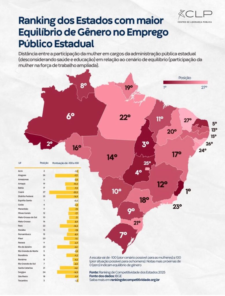 De acordo com o estudo, “Equilíbrio de Gênero no Emprego Público Estadual”, o Acre ficou atrás apenas do Espírito Santo, que obteve a primeira colocação, já em último lugar do ranking aparece o estado do Ceará, registrando a menor distância em relação ao equilíbrio.