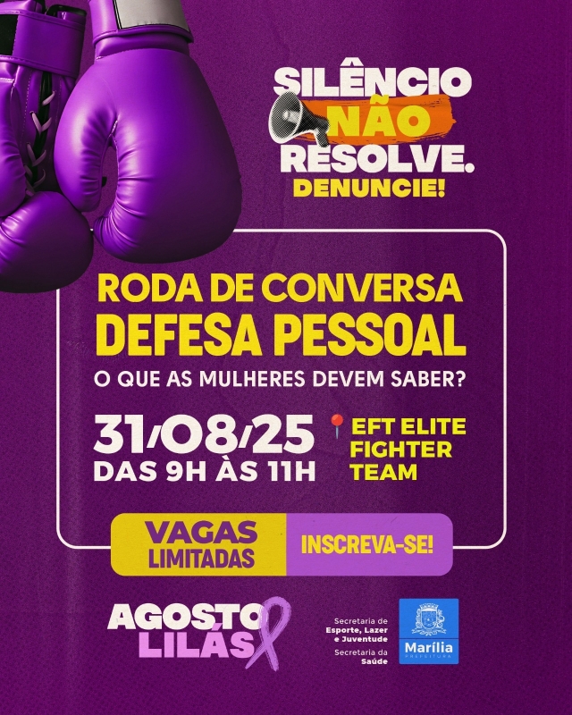A Prefeitura de Marília – por meio da Secretaria Municipal de Saúde e do Núcleo de Prevenção e Cuidado à Pessoa em Situação de Violência (SS-PREVIO), e em parceria com a Secretaria Municipal de Esportes, Lazer e Juventude, realiza neste domingo (31/08), das 9h às 11h, a roda de conversa e aula prática sobre Defesa Pessoal: O que as mulheres devem saber?