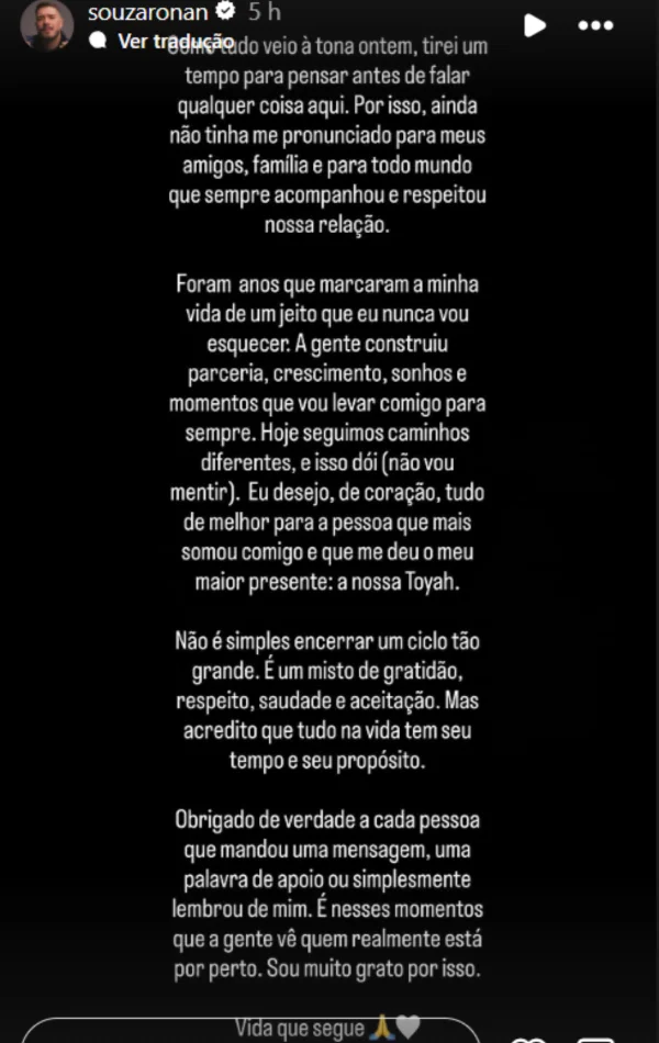 Ronan ressaltou ainda que encerrar uma relação tão longa envolve sentimentos diversos e exige aceitação, algo que está buscando neste novo momento.