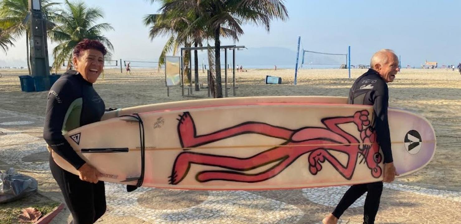 Os vovôs surfistas aproveitam o máximo da vida. Há 20 anos, toda terça-feira pegam onda com a turma 50+ da Escola Radical de Surf, da Prefeitura de Santos. Além de dividirem a paixão pelo esporte, eles pescam e se apresentam juntos como dubladores do grupo Show Purpurina/Cantores do Rádio nas vilas criativas.