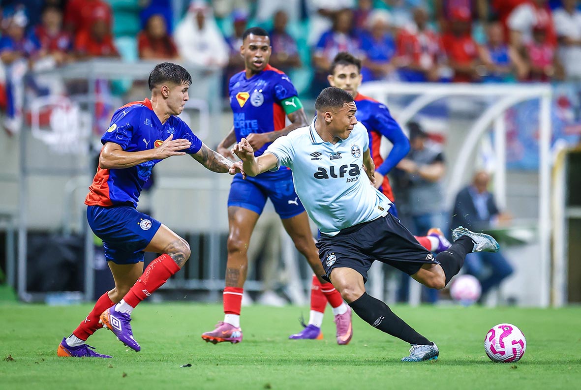 O Tricolor baiano não deu tempo para o Grêmio respirar. Com apenas quatro minutos de jogo, o placar já era inaugurado: Iago recebeu um passe preciso de Ademir dentro da grande área e finalizou com maestria para balançar as redes.