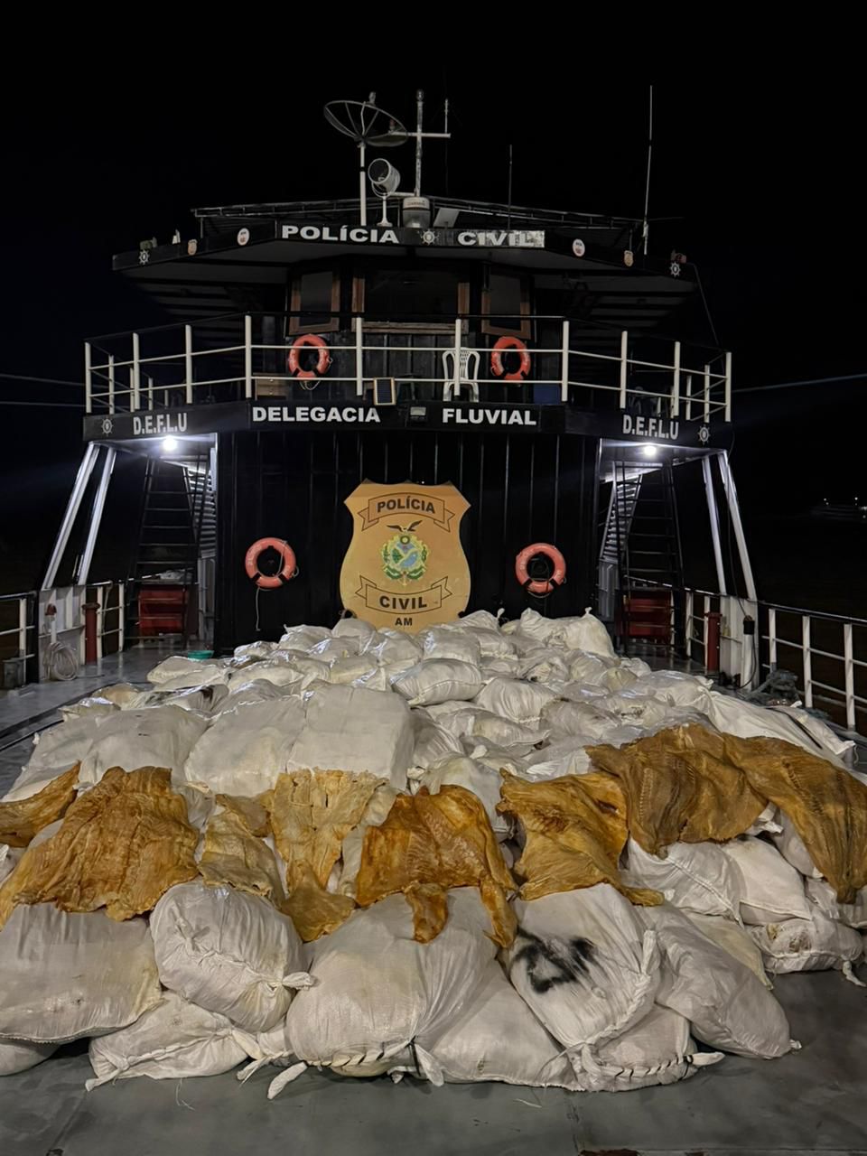 A Polícia Civil do Amazonas (PC-AM) em operação na Base Fluvial Paulo Pinto Nery, apreendeu, na sexta-feira (09/01), nas proximidades de Itacoatiara (a 176 quilômetros de Manaus), 12 toneladas de pirarucu seco. O pescado estava dentro de uma embarcação, que tinha como destino a cidade de Parintins. Duas pessoas foram detidas por suspeita de crime ambiental.