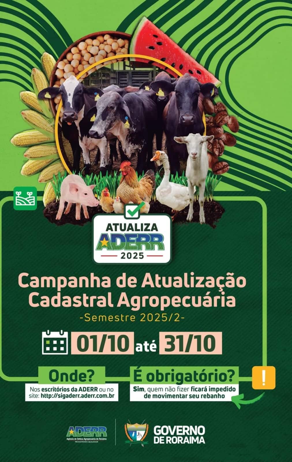 O Governo de Roraima, por meio da Aderr (Agência de Defesa Agropecuária de Roraima), inicia no próximo dia 1º de outubro a Campanha de Atualização Cadastral de Rebanhos 2025. O prazo segue até 31 de outubro e é obrigatório para todos os produtores rurais do Estado.