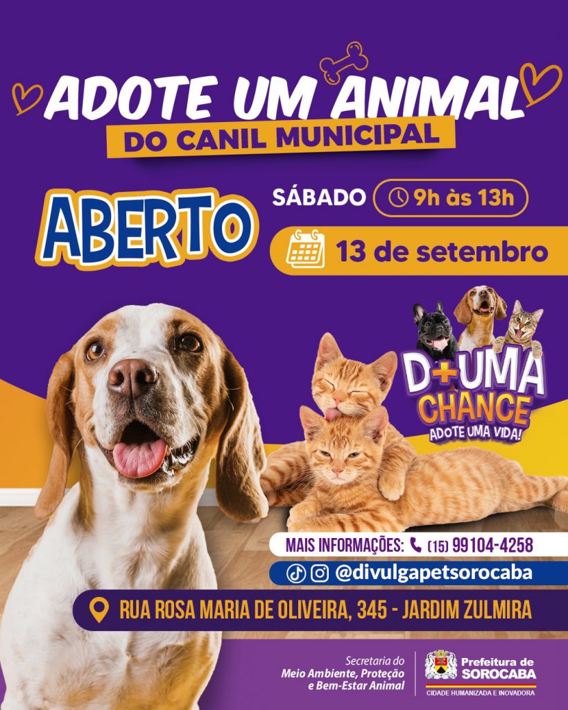 A Prefeitura de Sorocaba, por meio da Secretaria do Meio Ambiente, Proteção e Bem-Estar Animal (Sema), abrirá, neste sábado (13), das 9h às 13h, o Canil Municipal. As famílias terão a oportunidade de conhecer os animais resgatados pela Seção de Proteção e Bem-Estar Animal, entre cães e gatos, em sua grande maioria vítimas de maus-tratos, que estão a espera de um novo lar.
