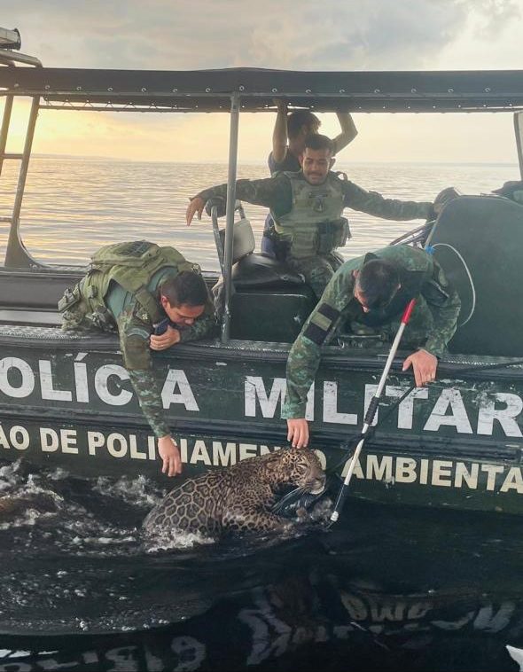 Polícia Militar do Amazonas resgata onça ferida por disparos de arma de fogo no Rio Negro