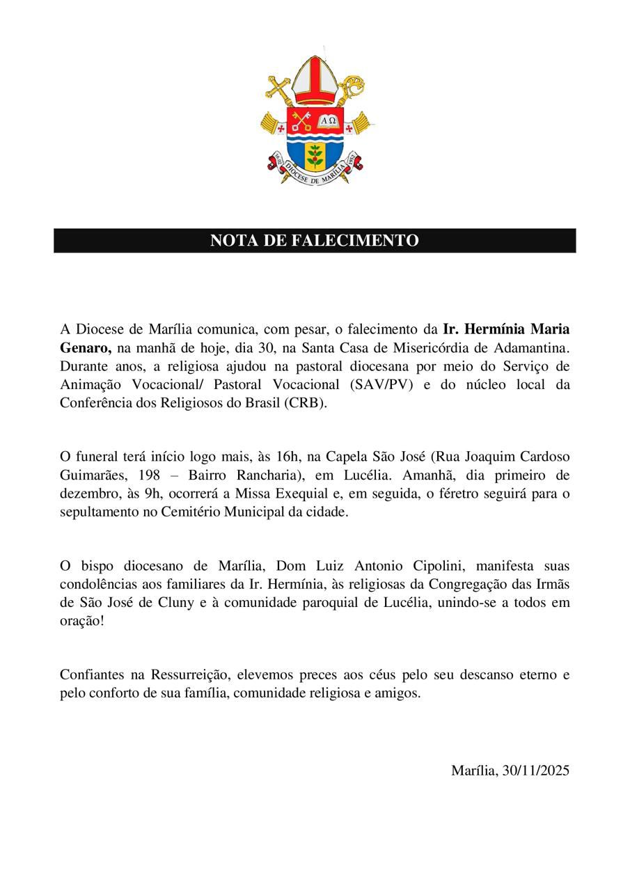 A Diocese de Marília comunicou o falecimento da Irmã Hermínia Maria Genaro, ocorrido na Santa Casa de Misericórdia de Adamantina. A religiosa era membro da Congregação das Irmãs do Sagrado Coração de Maria e dedicou toda a sua vida à missão pastoral e vocacional da Igreja Católica. Ao longo de sua trajetória, Irmã Hermínia atuou intensamente na pastoral diocesana, especialmente por meio do Serviço de Animação Vocacional e da Pastoral Vocacional (SAV/PV), além de colaborar com o núcleo local da Conferência dos Religiosos do Brasil (CRB). Seu trabalho foi reconhecido…
