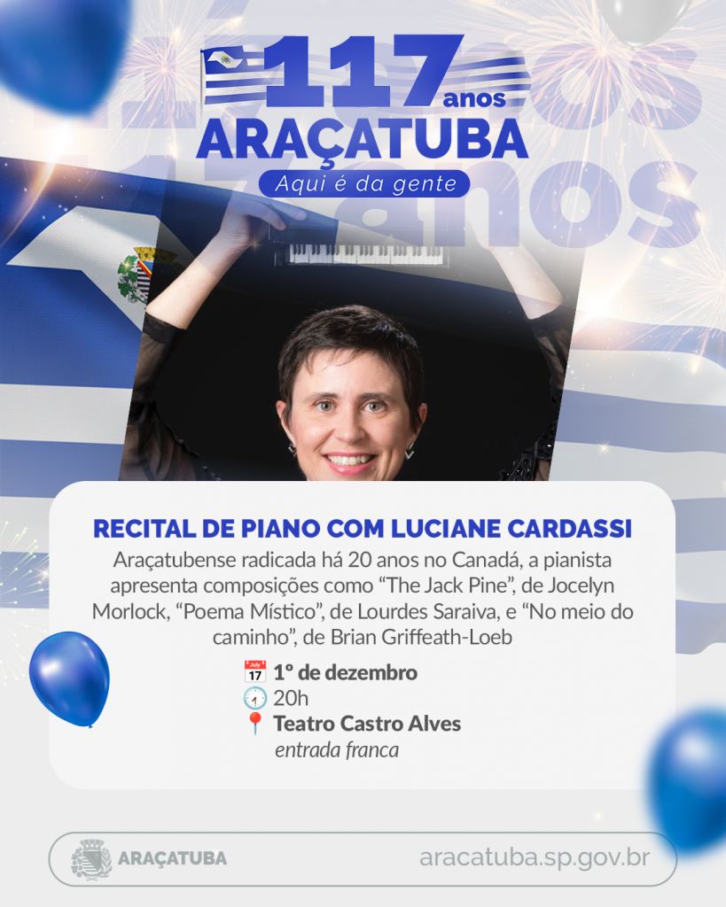 A pianista araçatubense Luciane Cardassi se apresenta nesta segunda-feira (1º), véspera do aniversário de 117 anos de Araçatuba, no Teatro Castro Alves. Com o “Recital de Piano (+Voz)”, a artista oferecerá à cidade uma noite de muita música, que inclui uma peça divertida com piano de brinquedo. A entrada é gratuita. No repertório há colaborações recentes de Luciane que dialogam com outras áreas artísticas, como arte visual de “The Jack Pine”, da compositora canadense Jocelyn Morlock, e com poesias de Lourdes Saraiva com o “Poema Místico” e de Brian Griffeath-Loeb…