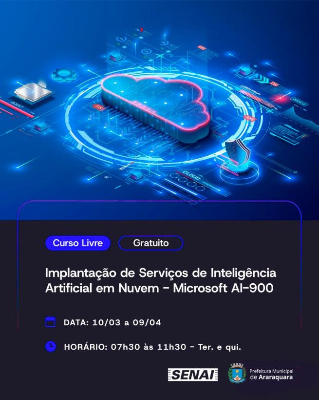 A Prefeitura de Araraquara, em parceria com o Serviço Nacional de Aprendizagem Industrial (SENAI), está com matrículas abertas para o curso Implantação de Serviços de Inteligência Artificial em Nuvem – Microsoft AI-900. A formação é gratuita e voltada a quem já possui conhecimentos básicos de informática, adquiridos em cursos, no trabalho ou de forma autodidata.Com carga horária de 40 horas, o curso será realizado entre 10 de março e 9 de abril de 2026, às terças e quintas-feiras, das 7h30 às 11h30. As aulas acontecem ao longo de quase um…