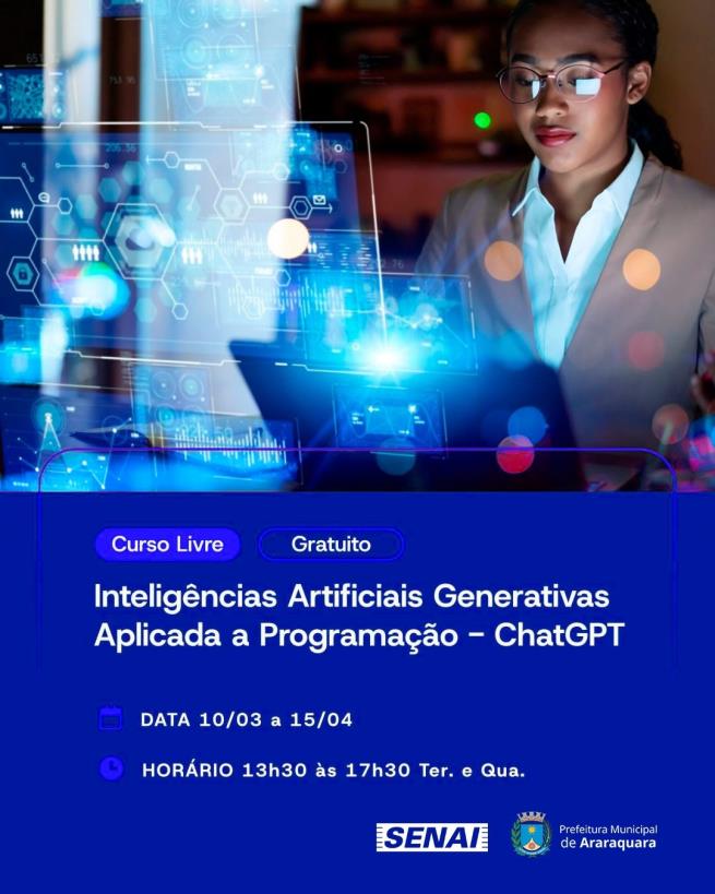 A Prefeitura de Araraquara, em parceria com o Serviço Nacional de Aprendizagem Industrial (SENAI), está com matrículas abertas para o curso gratuito Inteligências Artificiais Generativas Aplicadas à Programação – ChatGPT, com carga horária de 48 horas.Voltado a profissionais e estudantes da área de Tecnologia da Informação, o curso tem como objetivo capacitar os participantes para aplicar ferramentas de Inteligência Artificial Generativa no desenvolvimento de soluções, ampliando competências técnicas e fortalecendo o diferencial competitivo no mercado de trabalho.As aulas serão realizadas de 10 de março a 15 de abril de 2026,…
