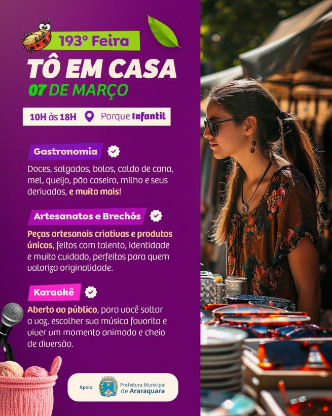 A feira Tô em Casa, neste sábado, 7 de março, chega com diversas opções para presentear, principalmente as mulheres, cuja comemoração acontece neste mês. A feira será realizada no Parque Infantil, na região central de Araraquara, das 10h às 18 horas.Oferecendo um dia de convivência ao ar livre, com boa comida, produtos autorais e atrações para todas as idades, a Tô em Casa também contará com Karaokê para a diversão do público presente no parque.Artesanato, brechós, bijuterias, acessórios, doces caseiros, salgados, mel, milho e derivados, caldo de cana, queijos, licores,…