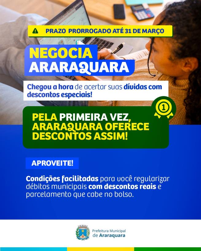 Na última sexta-feira (27 de fevereiro) foi publicado o edital de prorrogação do prazo de vigência do programa “Negocia Araraquara”. A iniciativa facilita a regularização de débitos fiscais dos contribuintes, ou seja, a quitação de dívidas junto ao poder público municipal com desconto e possibilidade de parcelamento. O novo prazo vai até o dia 31 de março de 2026.A adesão pode ser feita pela internet, no link https://araraquara.1doc.com.br/b.php?pg=o/dados_servico&service=01J4SDSTFM95E7F7RVH21KYF3B ou presencialmente, no Paço Municipal e nos demais postos de atendimento da Prefeitura (consulte os endereços abaixo).Podem ser regularizados os seguintes débitos,…