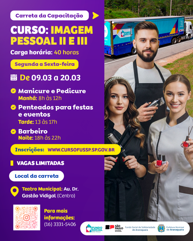 O Fundo Social do Estado de São Paulo, em parceria com o Fundo Social de Solidariedade de Araraquara, traz para o município o projeto Caminho da Capacitação. São cursos gratuitos nas áreas de cuidados pessoais (barbeiro, manicure e pedicure e penteados para festas e eventos) e de manutenção de motos. As aulas acontecem de 9 a 20 de março, numa carreta móvel equipada com estrutura para atividades teóricas e práticas. A carreta ficará no Teatro Municipal, localizado na Av. Gastão Vidigal, s/n, Centro. As inscrições podem ser feitas pelo site…