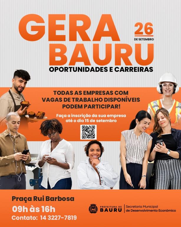 A Prefeitura de Bauru, por meio da Secretaria de Desenvolvimento Econômico, Turismo e Inovação (Sedecon), realizará a 8ª edição do ‘Gera Bauru – Oportunidades e Carreiras’ e promoverá o já tradicional mutirão de empregos. Reunindo empresas de diversos segmentos, universidades, faculdades, sistema S, Organizações da Sociedade Civil (OSCs) e o Conselho do Trabalho, Emprego e Renda, a iniciativa busca fomentar o desenvolvimento da cidade, proporcionando recolocação profissional e capacitação para o mercado de trabalho. A 8ª edição será realizada na Praça Rui Barbosa, no Centro, no dia 26 de setembro,…