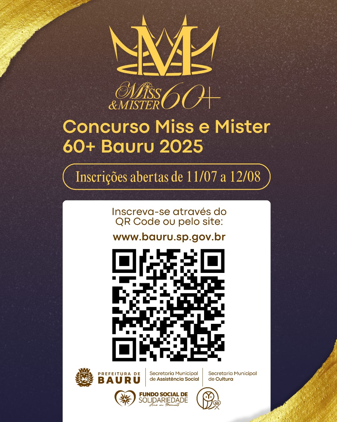 A Prefeitura de Bauru, por meio das Secretarias de Cultura, de Assistência Social e do Fundo Social de Solidariedade, segue com inscrições abertas para a 14ª edição do concurso ‘Miss e Mister 60+’ Bauru 2025, organizado em parceria com o Conselho Municipal da Pessoa Idosa (Comupi). As inscrições ficarão disponíveis até o dia 12 de agosto, no link https://www2.bauru.sp.gov.br/inscricao.aspx?i=48 Podem participar as pessoas com 60 anos de idade ou mais. O evento está previsto para o dia 1 de outubro, às 19h. O concurso ‘Miss e Mister 60+’ Bauru é…