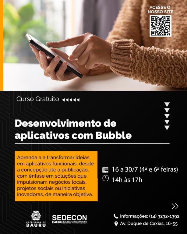 A Prefeitura de Bauru, por meio da Secretaria de Desenvolvimento Econômico, Turismo e Inovação (Sedecon) e seu Centro de Inovação Tecnológica (CIT), está com inscrições abertas para o curso ‘Desenvolvimento de aplicativos com Bubble’. Os participantes terão uma imersão prática no desenvolvimento de aplicativos sem código, utilizando a plataforma Bubble, com foco especial na capacitação de adolescentes e pequenos empreendedores para crescer no mercado. Os alunos aprenderão a transformar ideias em aplicativos funcionais, desde a concepção até a publicação, com ênfase em soluções que impulsionam negócios locais, projetos sociais ou…