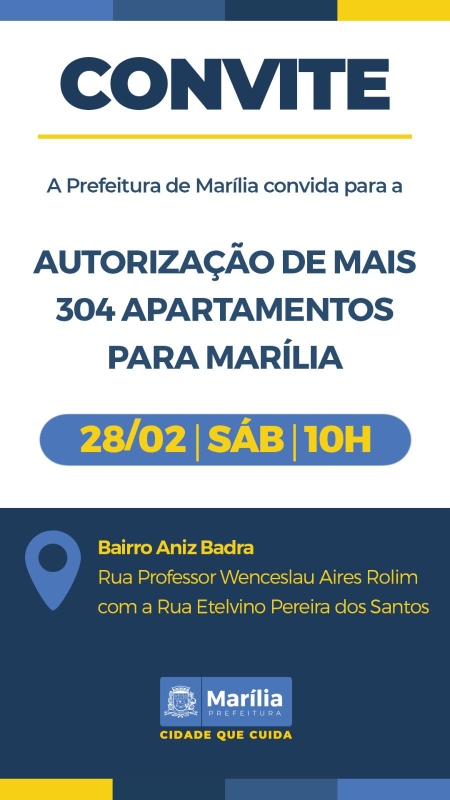 A Prefeitura de Marília anuncia neste sábado (28/02) a construção de 304 apartamentos no bairro “Dr. Aniz Badra”, na zona Norte da cidade. O evento será às 10h na Rua Professor Wenceslau Aires Rolim, esquina com a Rua Etelvino Pereira dos Santos. O Prefeito Vinicius Camarinha conquistou os apartamentos por meio do programa estadual “Nossa Casa”, após agenda no Palácio dos Bandeirantes (sede do governo paulista) no dia 04/02, ocasião em que participou de solenidade de assinatura do convênio de projetos de desenvolvimento habitacional entre a Prefeitura de Marília…