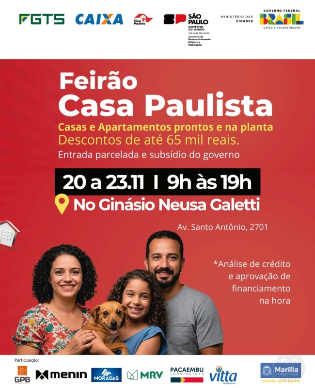 O Governo do Estado de São Paulo, em parceria com a Prefeitura de Marília, realiza entre os dias 20 e 23 de novembro, das 9h às 19h, a segunda edição do Feirão “Casa Paulista”, no Ginásio Neusa Galetti, localizado na avenida Santo Antônio, nº 2701, na zona Oeste da cidade. Após o sucesso da primeira edição realizada neste ano, o evento retorna a Marília reunindo importantes construtoras e representantes do setor imobiliário, oferecendo mais de mil oportunidades de moradia para famílias que desejam conquistar a casa própria. Entre…