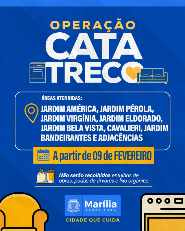 A Prefeitura de Marília, por meio da Secretaria Municipal do Meio Ambiente e Serviços Públicos, dá continuidade na segunda-feira (dia 9), a mais uma nova etapa da Operação Cata Treco, com atendimento aos bairros América, Pérola, Virgínia, Eldorado, Bela Vista, Cavalieri, Bandeirantes e adjacências – localizados na região Oeste da cidade. Os trabalhos de recolhimento são realizados das 8h às 16h. A ação tem como objetivo auxiliar os moradores no descarte correto de materiais inservíveis, contribuindo para a limpeza urbana e para a prevenção de focos do mosquito da…