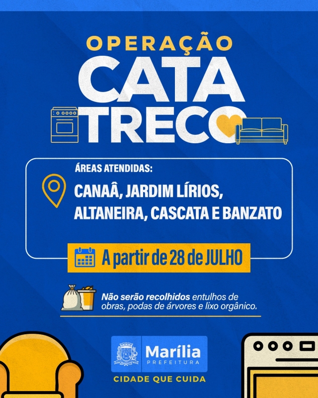 A Prefeitura de Marília realiza, a partir desta segunda-feira, 28 de julho, mais uma etapa da Operação Cata-Treco, com atendimento nos bairros Canaã, Jardim dos Lírios, Altaneira, Cascata e Banzato. A ação ocorre das 8h às 16h e visa recolher materiais inservíveis descartados corretamente pelos moradores, promovendo a limpeza urbana e a eliminação de criadouros do mosquito da dengue. Podem ser colocados nas calçadas móveis antigos, eletrodomésticos quebrados, estofados, pneus, telhas e demais objetos que possam acumular água. Todo o material deixado corretamente será recolhido pelas equipes da operação…