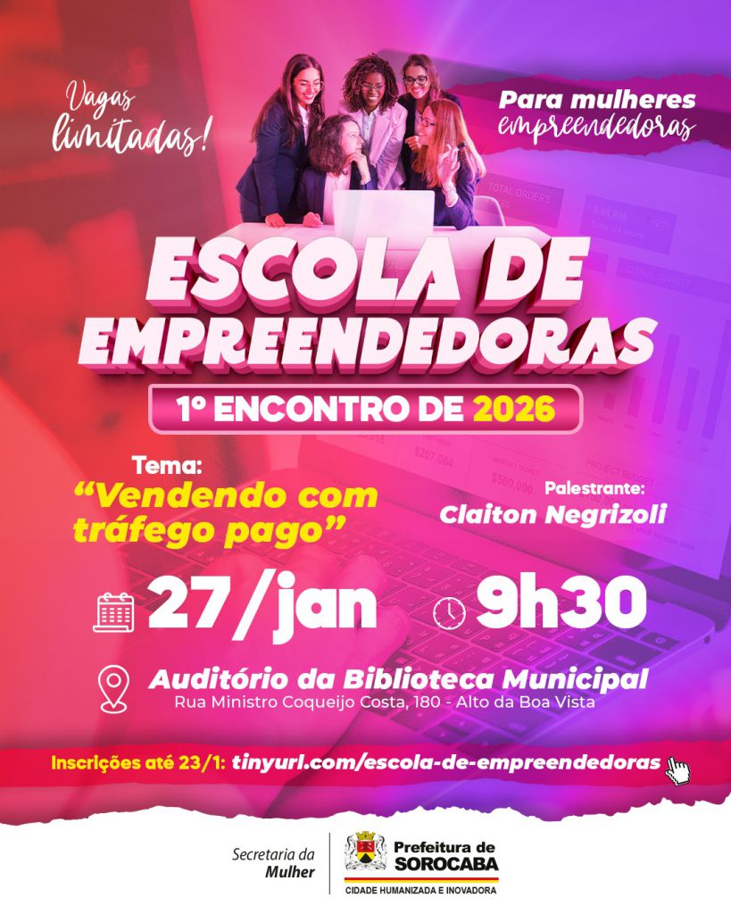 A Secretaria da Mulher (Semul) está com inscrições abertas para o primeiro encontro do ano para mulheres empreendedoras interessadas em obter capacitação em técnica de Vendas com Tráfego Pago. O primeiro encontro acontecerá no próximo dia 27 de janeiro, uma terça-feira, às 9h30, no auditório da Biblioteca Municipal de Sorocaba, com o palestrante Claiton Negrizoli. Os encontros seguintes acontecerão toda última terça-feira do mês, para que as mulheres empreendedoras possam aprender com profissionais da área e melhorar suas vendas, usando a tecnologia a seu favor. As vagas são limitadas e serão…