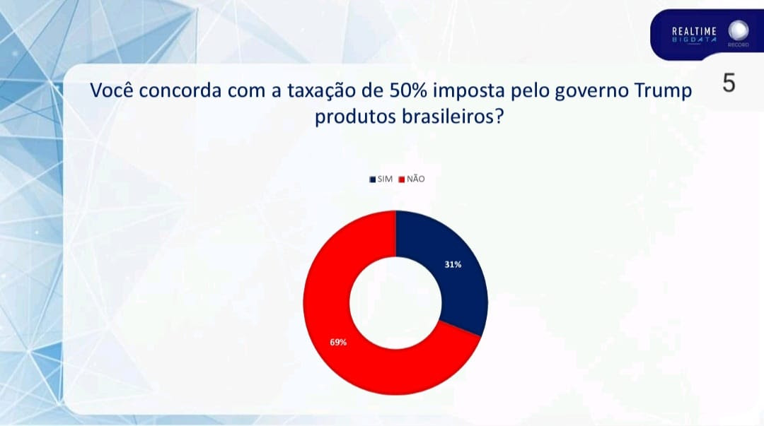 Pesquisa do Instituto de Pesquisa Realtime Bigdata aponta ainda que 69% dos brasileiros não concordam com o tarifaço de 50% imposto ao país pelo governo dos EUA Novo levantamento do Instituto de Pesquisa Realtime Big Data aponta: 66% dos brasileiros acreditam que o Brasil deve impor tarifas aos produtos americanos, em retaliação ao tarifaço de 50% imposto pelo presidente Donald Trump à importação de produtos brasileiros. A margem de erro da pesquisa é de 3 pontos percentuais, para mais ou para menos, com nível de confiança de 95%. No total,…