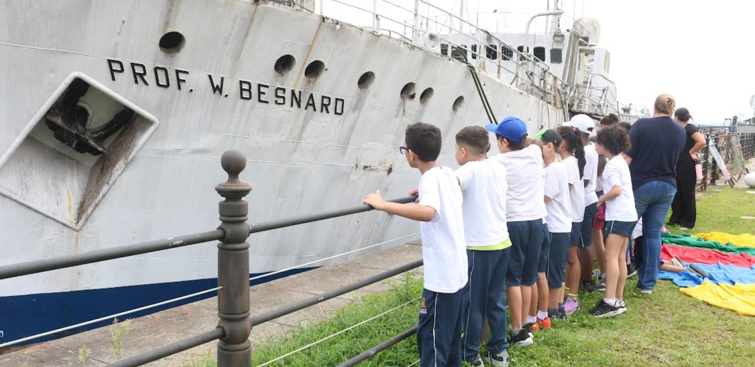 Cerca de 50 alunos dos 3º, 4º e 5º anos da UME João Papa Sobrinho (Gonzaga) conheceram navio Professor Wladimir Besnard, primeira embarcação brasileira a chegar ao continente antártico e atualmente uma das atrações do Parque Valongo, nesta quarta-feira (3), durante atividade de estudo do meio do Projeto Antártica na Escola. Além de conhecer a embarcação histórica, os estudantes se envolveram em atividades que conectam literatura, ciência e história. Antes de conhecerem mais sobre a embarcação, os alunos participaram de uma roda de histórias sobre a Antártica, baseada no livro Suvaco Polar…