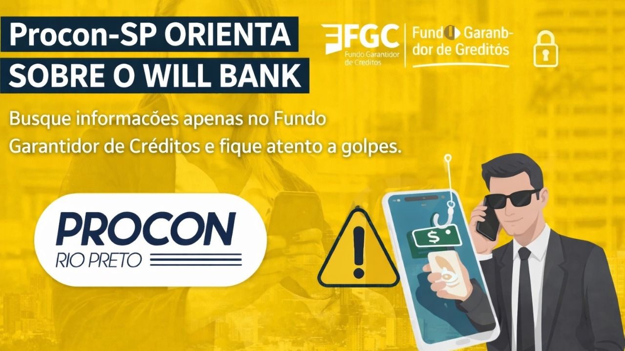 Consumidores devem buscar informações apenas em canais oficiais e ficar atentos a golpes Por: Malu Mendes Arquivoo pessoal / SMCS Resumo da matéria: Procon-SP orienta consumidores do Will Bank a buscarem informações em canais oficiais e alerta sobre riscos de golpes. O Procon-SP divulgou orientações aos consumidores que possuem conta, investimentos ou outros serviços vinculados ao Will Bank, que passa por processo de liquidação extrajudicial. O Procon Rio Preto reforça as informações para garantir segurança e evitar prejuízos à população. Cadastro no Fundo Garantidor de Créditos Consumidores com conta corrente,…