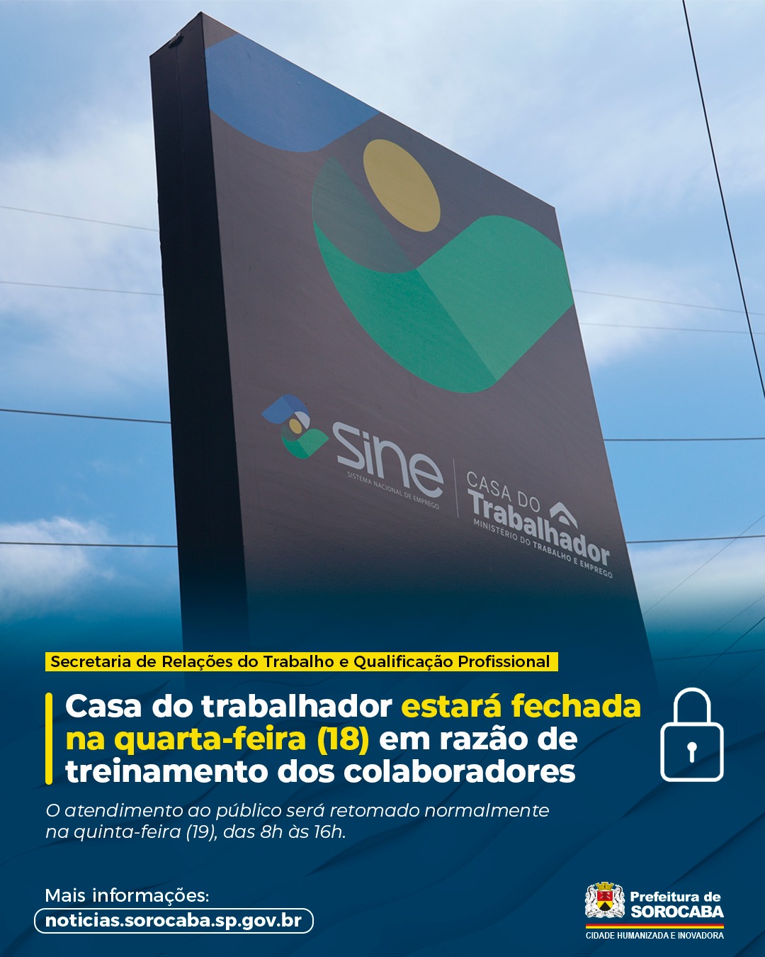 A Prefeitura de Sorocaba, por meio da Secretaria de Relações do Trabalho e Qualificação Profissional (Sert), informa que a unidade da Casa do Trabalhador, localizada no Centro, estará fechada quarta-feira (18). O atendimento ao público será retomado normalmente no dia 19 de fevereiro, das 8h às 16h. A suspensão temporária do atendimento ocorre em razão da realização de treinamento com todos os colaboradores da unidade, com o objetivo de qualificar ainda mais os serviços prestados e aprimorar o atendimento à população. A Sert agradece a compreensão de todos e reforça…