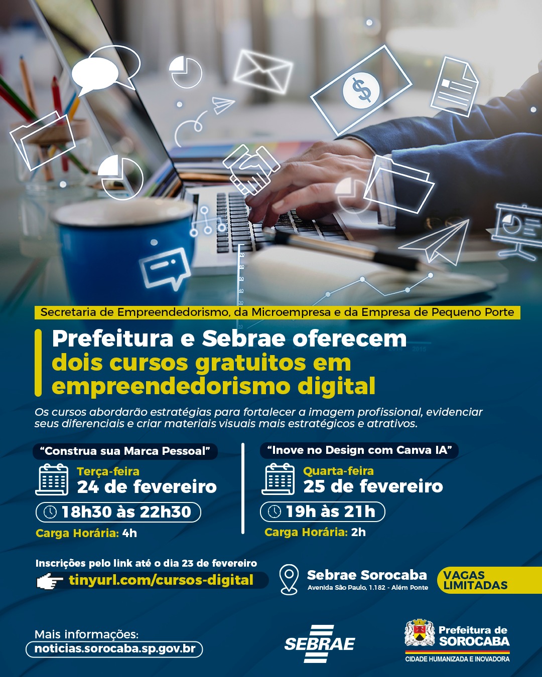 A Prefeitura de Sorocaba, por meio da Secretaria de Empreendedorismo, da Microempresa e da empresa de Pequeno Porte (Semepp) em parceria com o Serviço Brasileiro de Apoio às Micro e Pequenas Empresas (Sebrae) está com inscrições abertas para os cursos “Construa sua Marca Pessoal” e “Inove no Design com Canva IA”. Os cursos abordarão estratégias para fortalecer a imagem profissional, evidenciar seus diferenciais e criar materiais visuais mais estratégicos e atrativos. O curso “Construa sua Marca Pessoal” acontece no dia 24 de fevereiro (terça-feira), das 18h30 às 22h30 e conta com…