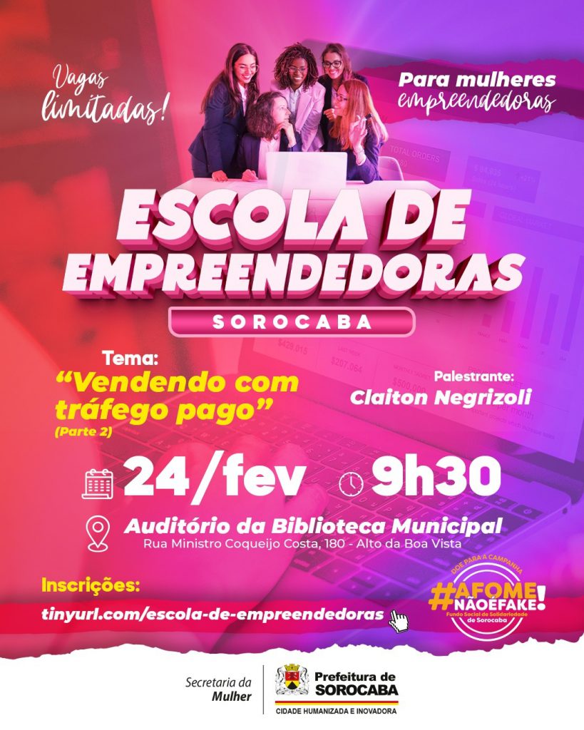 A Secretaria da Mulher (Semul) está com inscrições abertas para o segundo encontro do ano para mulheres empreendedoras interessadas em obter capacitação em técnica de Vendas com Tráfego Pago. O workshop será realizado no próximo dia 24 de fevereiro, uma terça-feira, às 9h30, no auditório da Biblioteca Municipal de Sorocaba, com o palestrante Claiton Negrizoli. Os encontros do programa Escola de Empreendedoras acontecerão mensalmente, toda última terça-feira do mês, para que as participantes possam aprender com profissionais da área e melhorar suas vendas, usando o conhecimento a seu favor. As vagas são limitadas e serão preenchidas por…