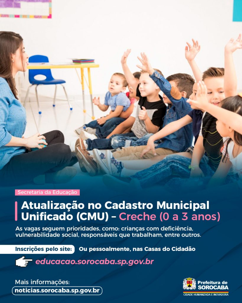 A Prefeitura de Sorocaba, por meio da Secretaria da Educação (Sedu), informa que, a pedido do Ministério Público, foi alterada a forma de atribuição de vagas para a etapa de Educação Infantil – Creche (0 a 3 anos), por meio do Cadastro Municipal Unificado (CMU). O que mudou, na prática A principal mudança é que a atribuição das vagas deixou de depender apenas de encaminhamentos pontuais e passou a seguir uma classificação organizada pelo sistema, com critérios objetivos e ordem de prioridade definida em decreto. O CMU funciona em duas…