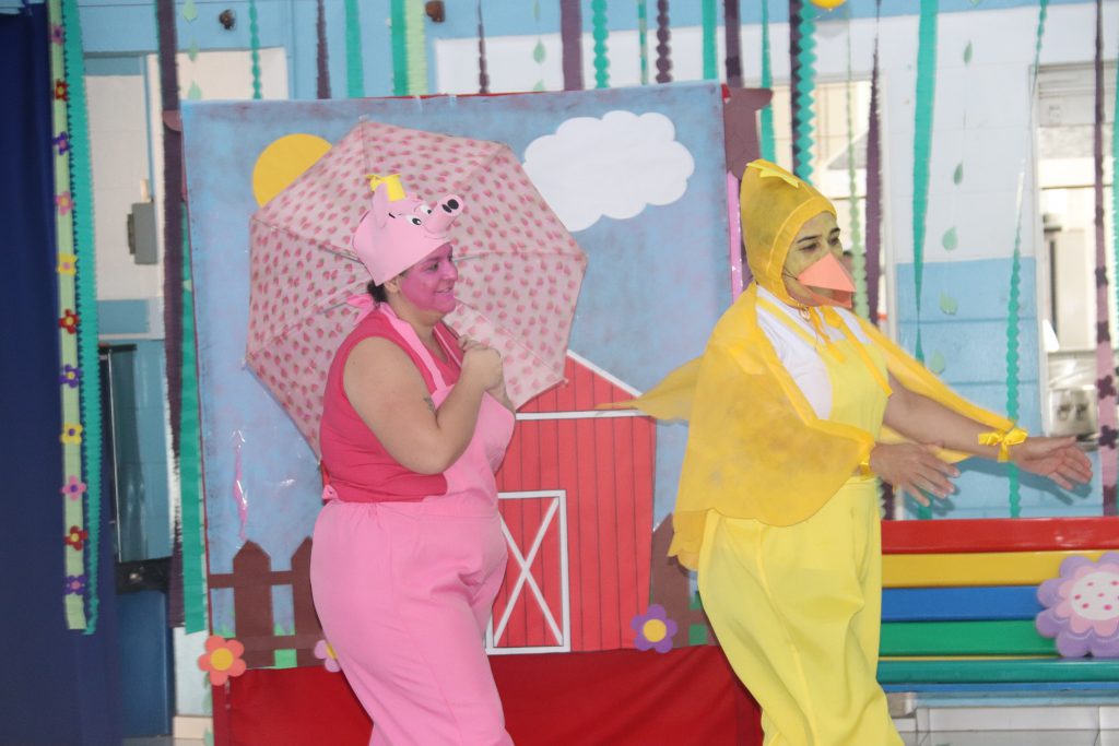 Assim, “O passeio da Porquinha” e “Pombinha branca”, que são clássicos entre as histórias e canções infantis, foram interpretadas com muita criatividade e talento pelos educadores, responsáveis desde o texto e execução musical até o figurino e produção do cenário.