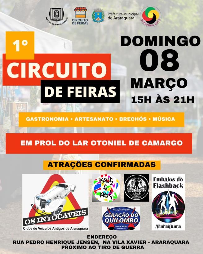 O domingo à tarde, 8 de março, na Vila Xavier promete muita animação com uma feira repleta de atrações, na rua em frente à Caixa da Água do DAAE. Das 15h às 21h é possível conferir arte, sugestões de presentes e delícias de empreendedores da cidade e região com o “Circuito das Feiras”.