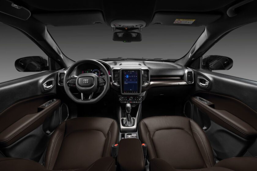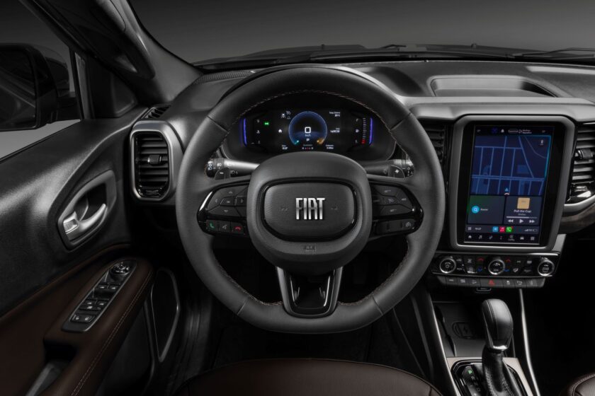 A linha Toro 2026 mantém seis versões — Endurance, Freedom, Volcano, Ultra, Ranch e Ultra — e duas opções de motorização: o Turbo 270 Flex, com 176 cavalos, e o 2.2 Multijet Turbodiesel, com 200 cavalos e 450 Nm de torque. A Ranch Diesel, que avaliei, segue no topo da linha, com acabamentos cromados, rodas diamantadas de 18” e interior marrom redesenhado. A linha estreia também os novos pacotes de serviços conectados Fiat Connect////Me, com opções que incluem Wi-Fi embarcado, assistência 24 horas e comandos remotos via aplicativo.