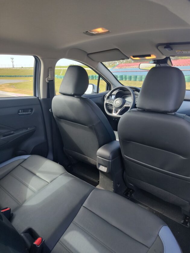 Os recursos de segurança chamaram a atenção, principalmente pela presença do pacote Nissan Intelligent Mobility, que agrega tecnologias como visão 360º inteligente com detecção de objetos em movimento, alerta de colisão frontal com assistente de frenagem, alerta de tráfego cruzado traseiro, monitoramento de ponto cego e alerta inteligente de atenção do motorista. Esses sistemas, aliados à boa visibilidade e aos sensores de estacionamento, tornam as manobras urbanas mais seguras e tranquilas.