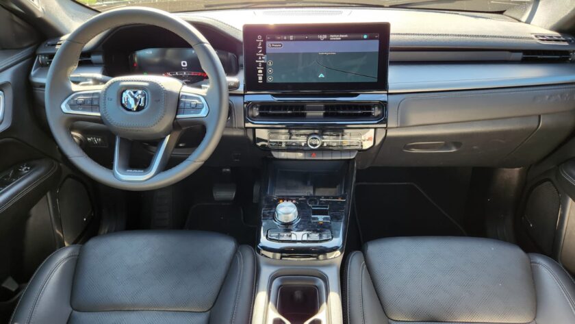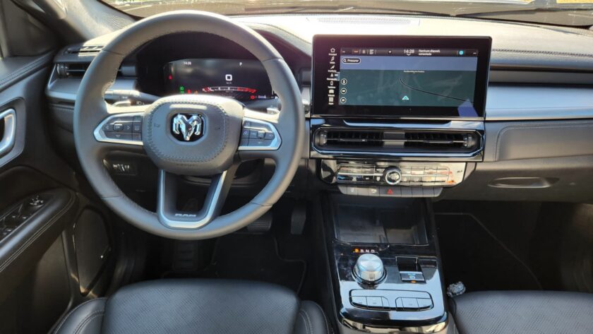 A caçamba com volume de 980 litros vem com iluminação em LED, tampa com abertura remota amortecida e ganchos para fixação de carga. A conectividade é outro destaque: são seis portas USB, carregador por indução, espelhamento sem fio para dois dispositivos e comandos via RAM Connect, que permite controle remoto de funções como partida do motor e abertura das portas.