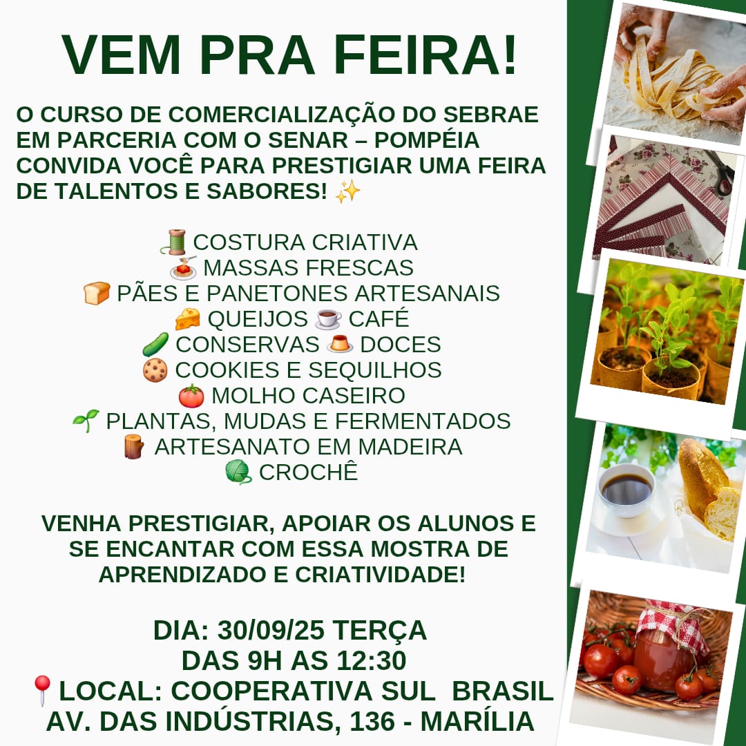 O SEBRAE, em parceria com o SENAR – Pompéia, tem a honra de convidar você para um evento que é muito mais do que uma exposição: é a celebração do conhecimento, da criatividade e do empreendedorismo!