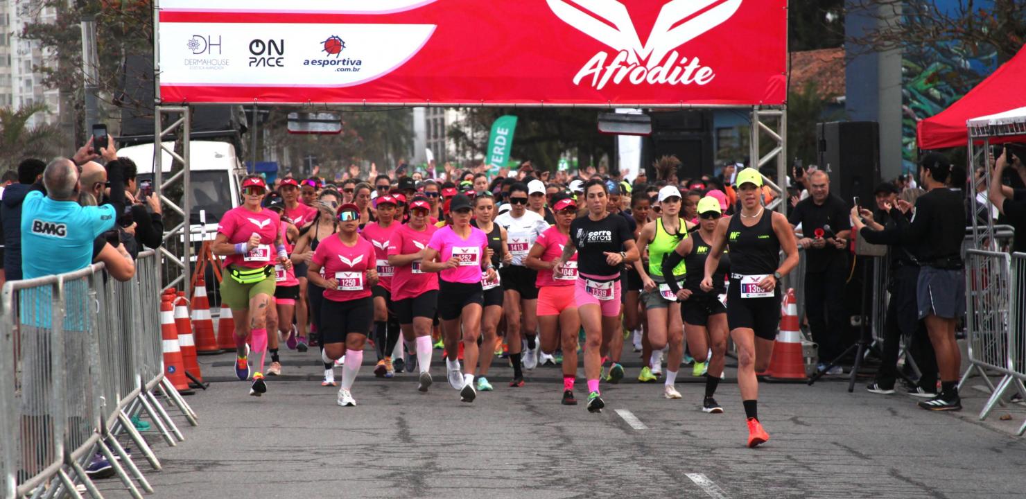 Mais do que lugar no pódio, o domingo (17) foi de celebração da força e união feminina com a 8ª edição da Corrida Afrodite, realizada na orla de Santos. A região do Aquário Municipal, na Ponta da Praia, foi tomada por 6.300 mulheres, a partir de 18 anos, em um clima de superação, incentivo e alegria.