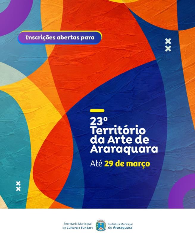 Estão abertas as inscrições de obras ou projetos em Artes Visuais para artistas e coletivos interessados em expor seus trabalhos na 23ª edição do Território da Arte de Araraquara. O edital da Secretaria Municipal de Cultura e Fundart já está disponível no site da Prefeitura de Araraquara, na aba “Editais da Cultura” e as inscrições podem ser realizadas até o dia 29 de março.