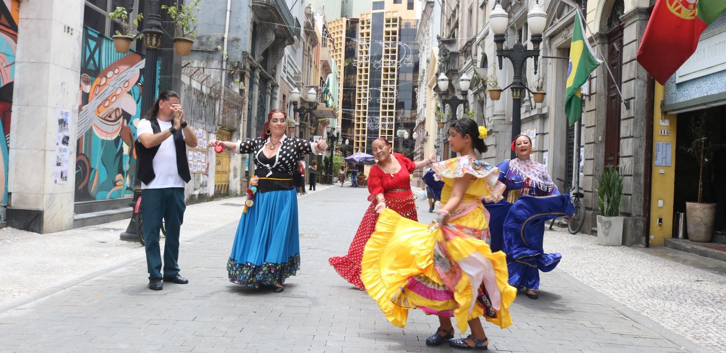 Cores, música e arte marcaram a tarde de sexta-feira (12) no Centro Histórico de Santos. A dança cigana tomou conta da Rua XV de Novembro com apresentação especial do Coletivo de Mulheres Ciganas Tsara Romai, como parte da programação da Semana dos Direitos Humanos.
