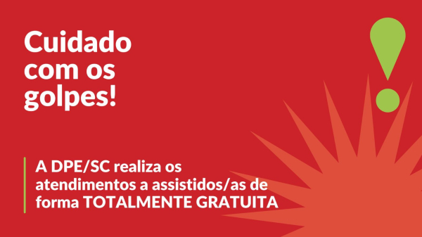 A Defensoria Pública do Estado de Santa Catarina (DPE-SC) reforça que todos os serviços de assistência jurídica oferecidos pelo órgão são totalmente gratuitos em todas as etapas de um processo judicial. Qualquer mensagem destinada aos assistidos que envolva cobrança de dinheiro ou oferta de ações com promessas de indenizações e divisão de valores é um golpe.