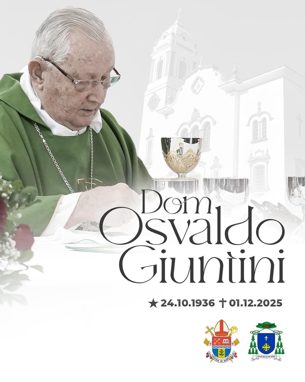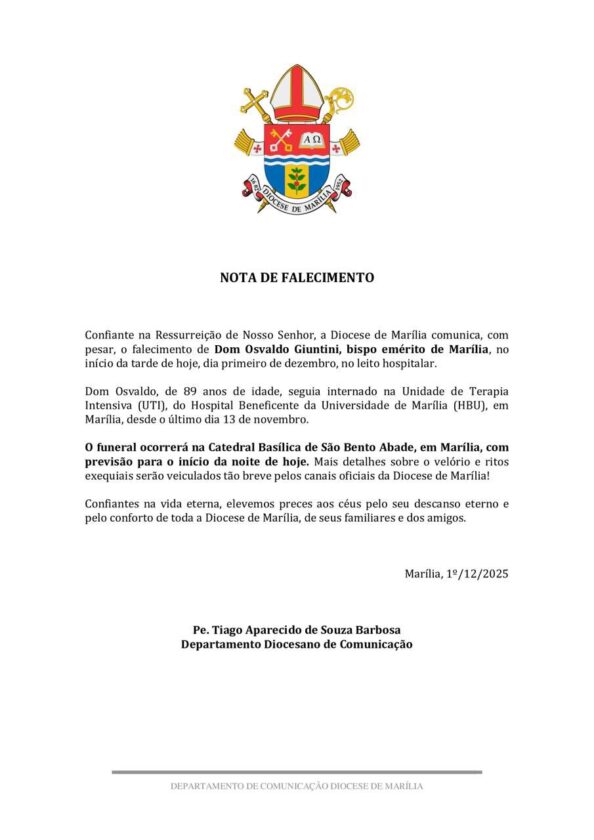 Confiante na Ressurreição, com pesar e cheia de gratidão pela vida e vocação de seu bispo emérito, a Diocese de Marília comunica, com pesar, o falecimento de Dom Osvaldo Giuntini no início da tarde hoje, dia primeiro de dezembro.