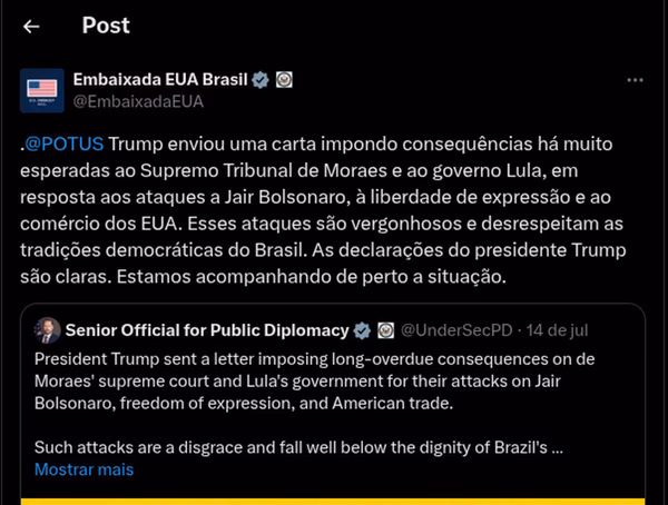 A primeira delas foi divulgada em 14 de julho, seis dias após Trump anunciar a tarifa de 50% contra os produtos do Brasil. Na época, a representação diplomática traduziu um comunicado do Alto Funcionário para Diplomacia Pública do Departamento de Estado dos EUA, Darren Beattie, sobre a retaliação econômica