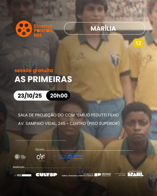 A Prefeitura de Marília, por meio da Secretaria da Cultura de Marília, em parceria com o Museu da Imagem e do Som, por meio do Programa Pontos MIS, apresenta nesta quinta-feira, 23/10, às 20h, sessão especial de cinema, com exibição do filme “As Primeiras”, documentário que retrata a vida de um grupo de mulheres que vivem nos subúrbios do Rio de Janeiro, com aproximadamente 60 anos e guardam um passado comum: são a base da primeira seleção feminina de futebol do Brasil.