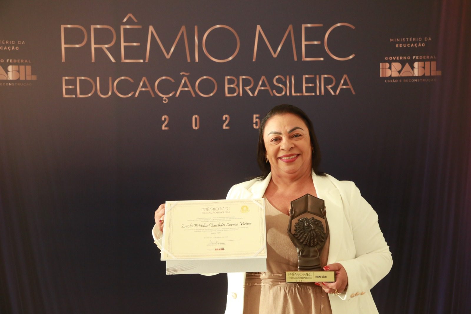 A EE Euclides Correa Vieira, premiada na categoria Ensino Médio, foi reconhecida por alcançar a maior pontuação do Ideb entre as unidades de ensino da região norte que oferecem a 1ª, 2ª e 3ª série do Ensino Médio. A escola foi premiada com R$ 100 mil, e foi representada pela diretora Gecilane Matozinho durante a cerimônia.